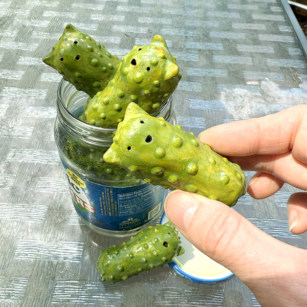 A lovely little pickle-shaped cat object handcrafted out of low-fired terra cotta with underglaze and clear glaze.